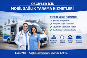 Organize Sanayi Bölgelerinde faaliyet gösteren işletmelerin en önemli sorumluluklarından biri, çalışanlarının sağlık ve güvenliğini en üst düzeyde sağlamaktır. İş sağlığı ve güvenliği mevzuatı kapsamında yapılması zorunlu olan sağlık taramaları, çoğu zaman iş akışında aksamalara ve zaman kaybına neden olabilmektedir. Bu ihtiyaca yönelik olarak ClinicMet, OSGB’lerde yer alan firmalara yerinde mobil sağlık tarama hizmetleri sunmaktadır.
