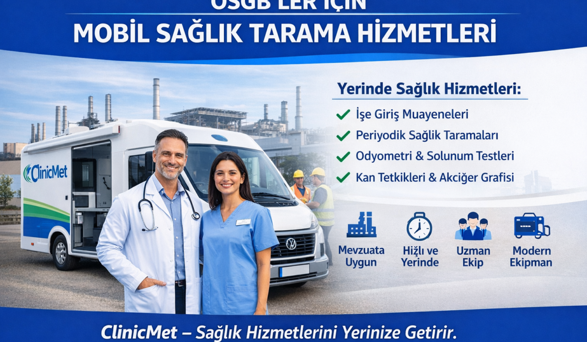 Organize Sanayi Bölgelerinde faaliyet gösteren işletmelerin en önemli sorumluluklarından biri, çalışanlarının sağlık ve güvenliğini en üst düzeyde sağlamaktır. İş sağlığı ve güvenliği mevzuatı kapsamında yapılması zorunlu olan sağlık taramaları, çoğu zaman iş akışında aksamalara ve zaman kaybına neden olabilmektedir. Bu ihtiyaca yönelik olarak ClinicMet, OSGB’lerde yer alan firmalara yerinde mobil sağlık tarama hizmetleri sunmaktadır.